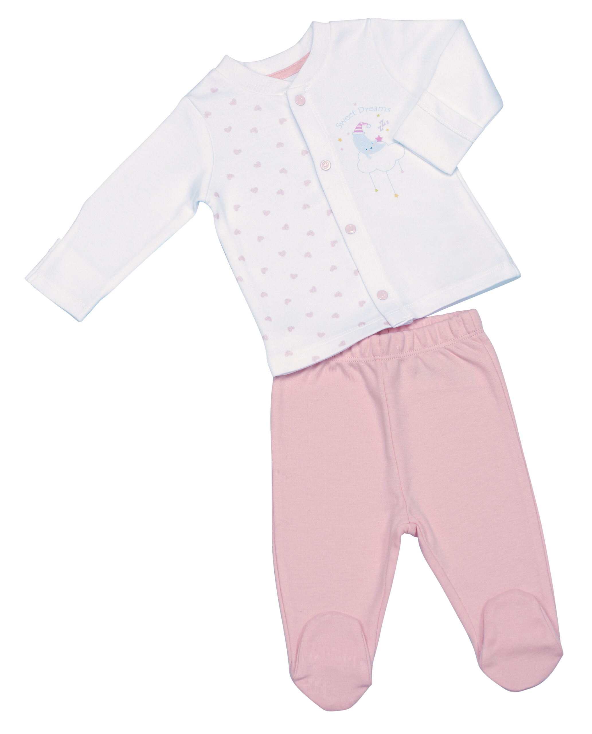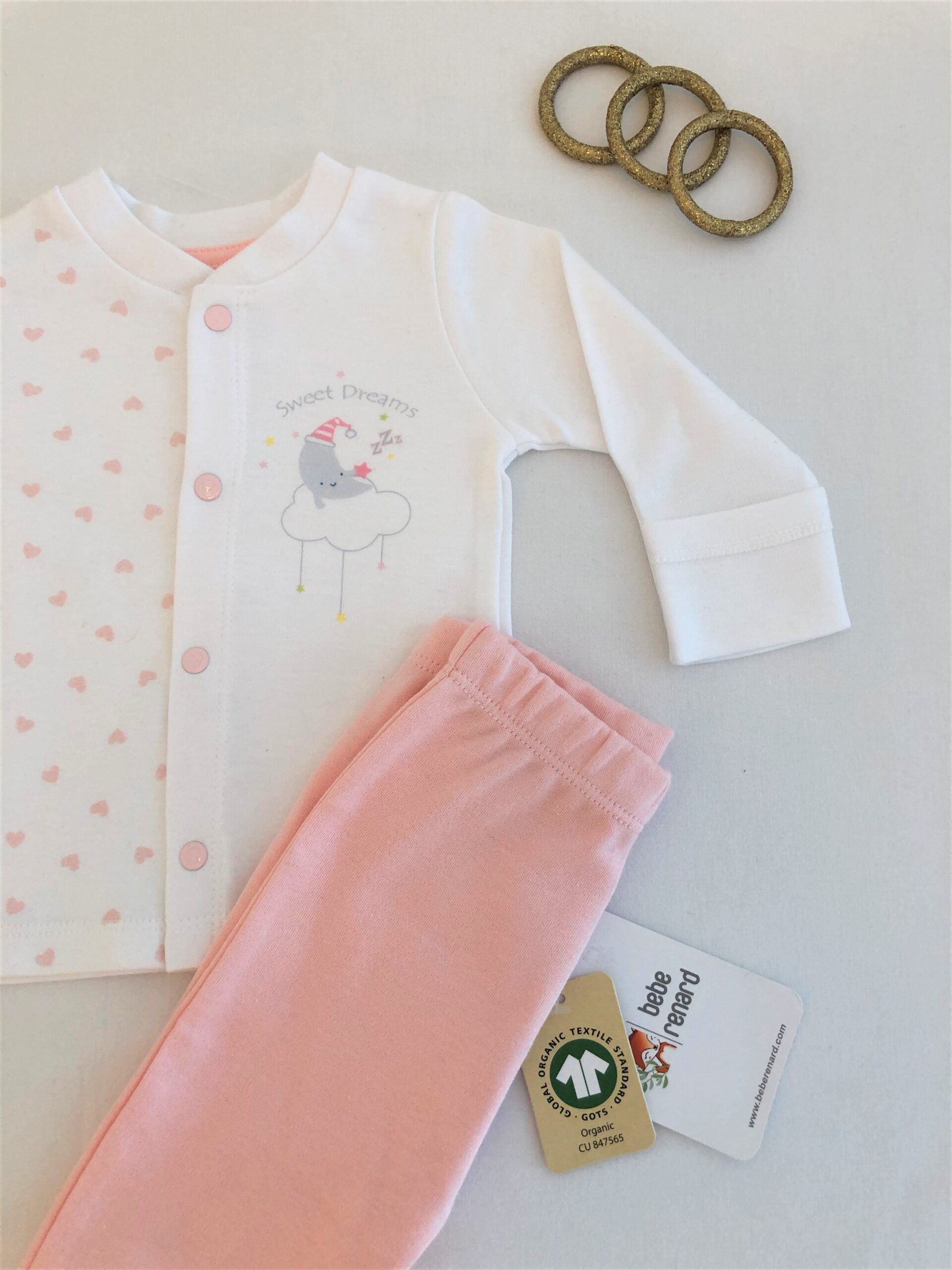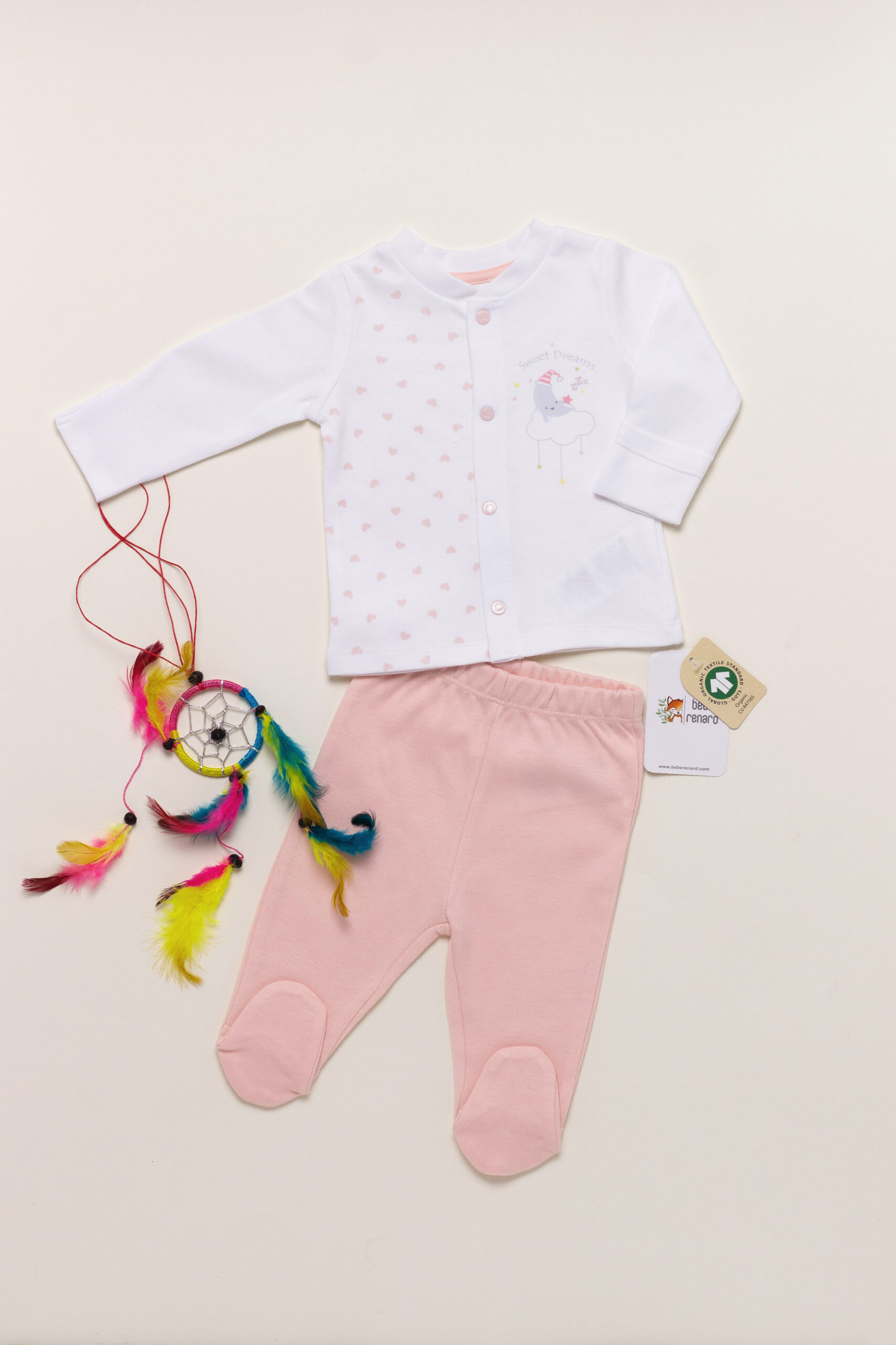 Ce deux-pièces particulièrement souple, en pur coton, procure une agréable sensation sur la peau. Pour un changement facile et rapide, le haut est muni de boutons pression. Le pantalon avec ceinture élastique et pieds offre un maintien optimal et garde les pieds confortablement au chaud.
